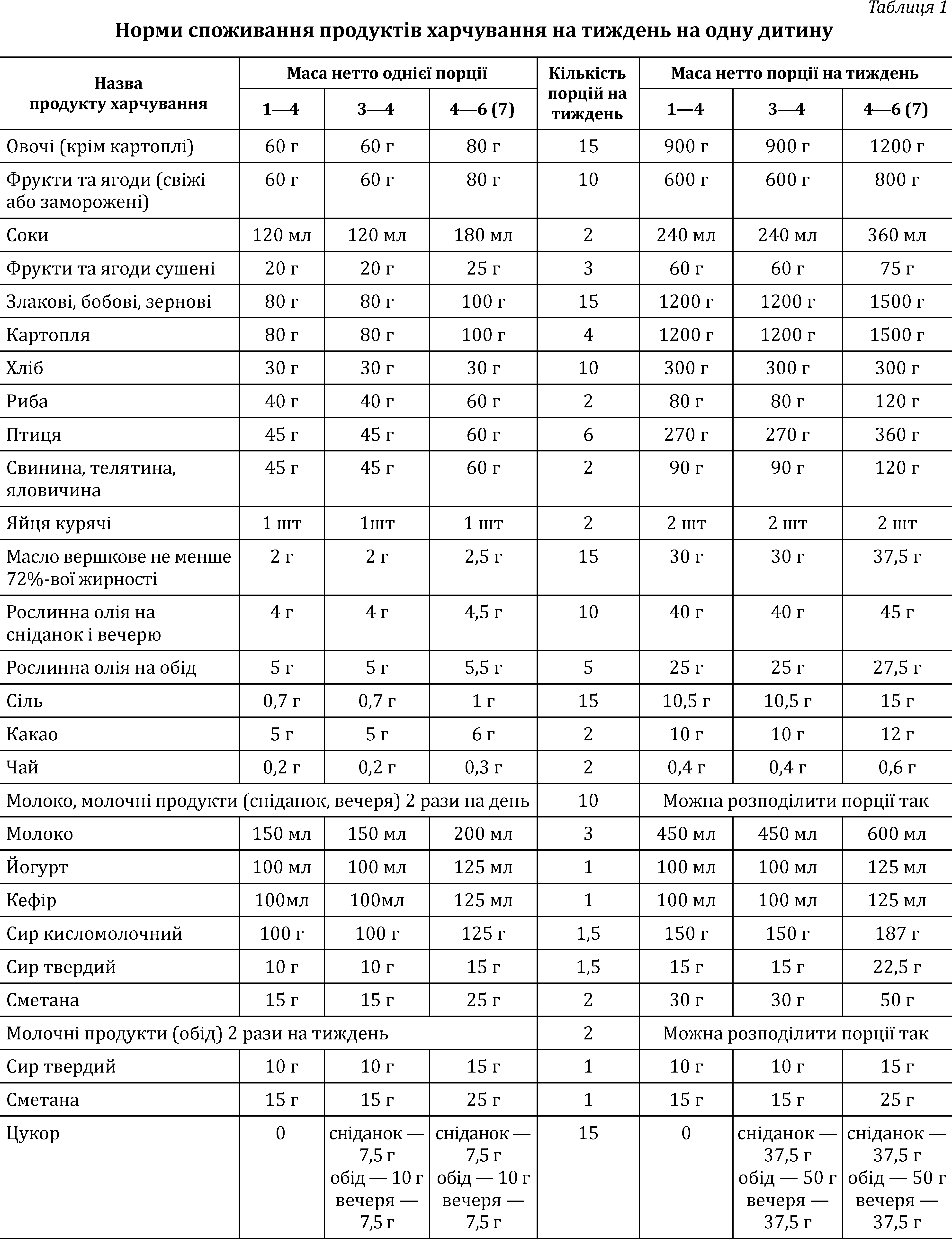 Це основний аспект для чотиритижневого меню на будь-який період. Дотримаєтеся норм споживання продуктів харчування — раціон дітей буде і повноцінним, і різноманітним (табл. 1).